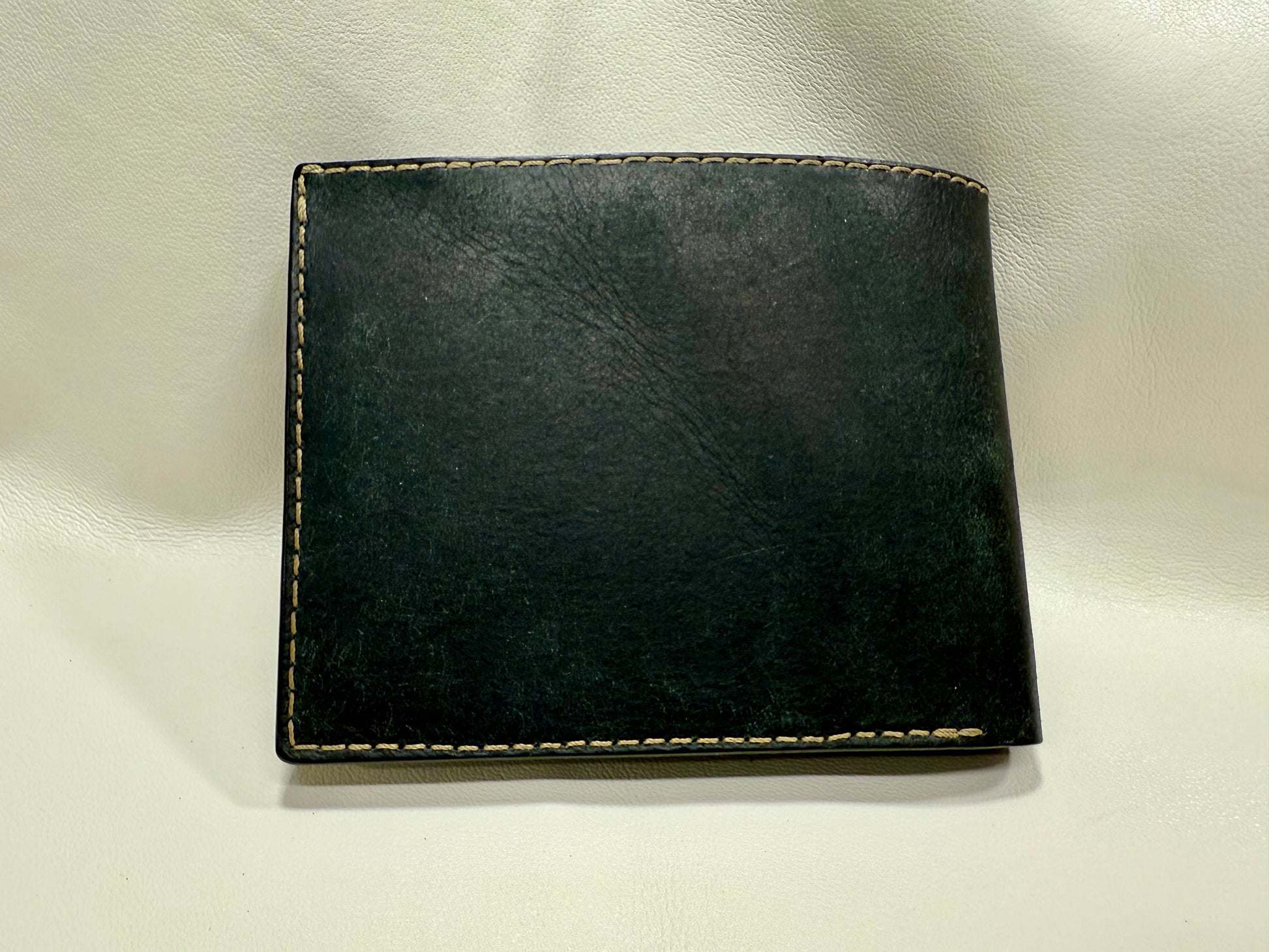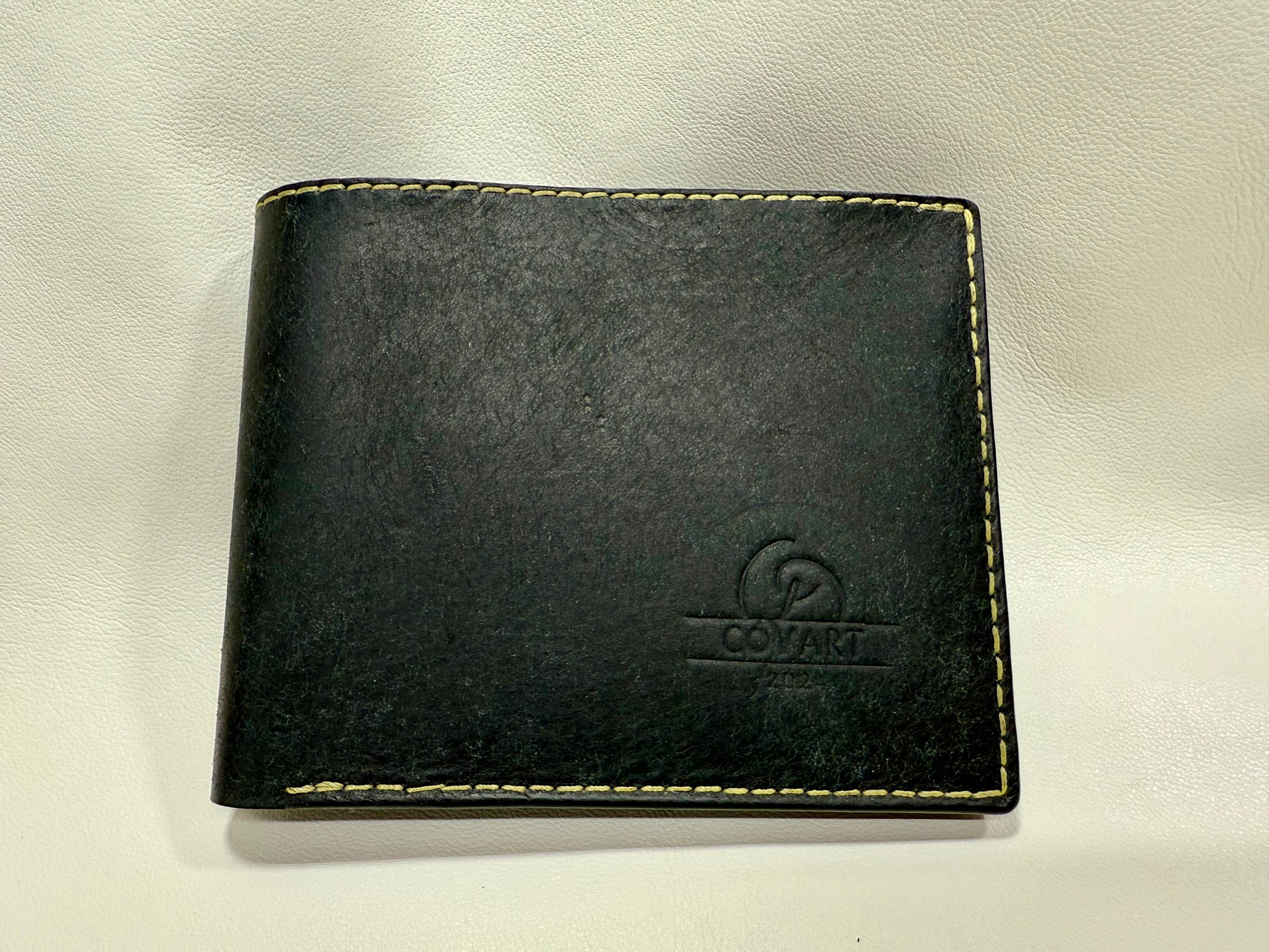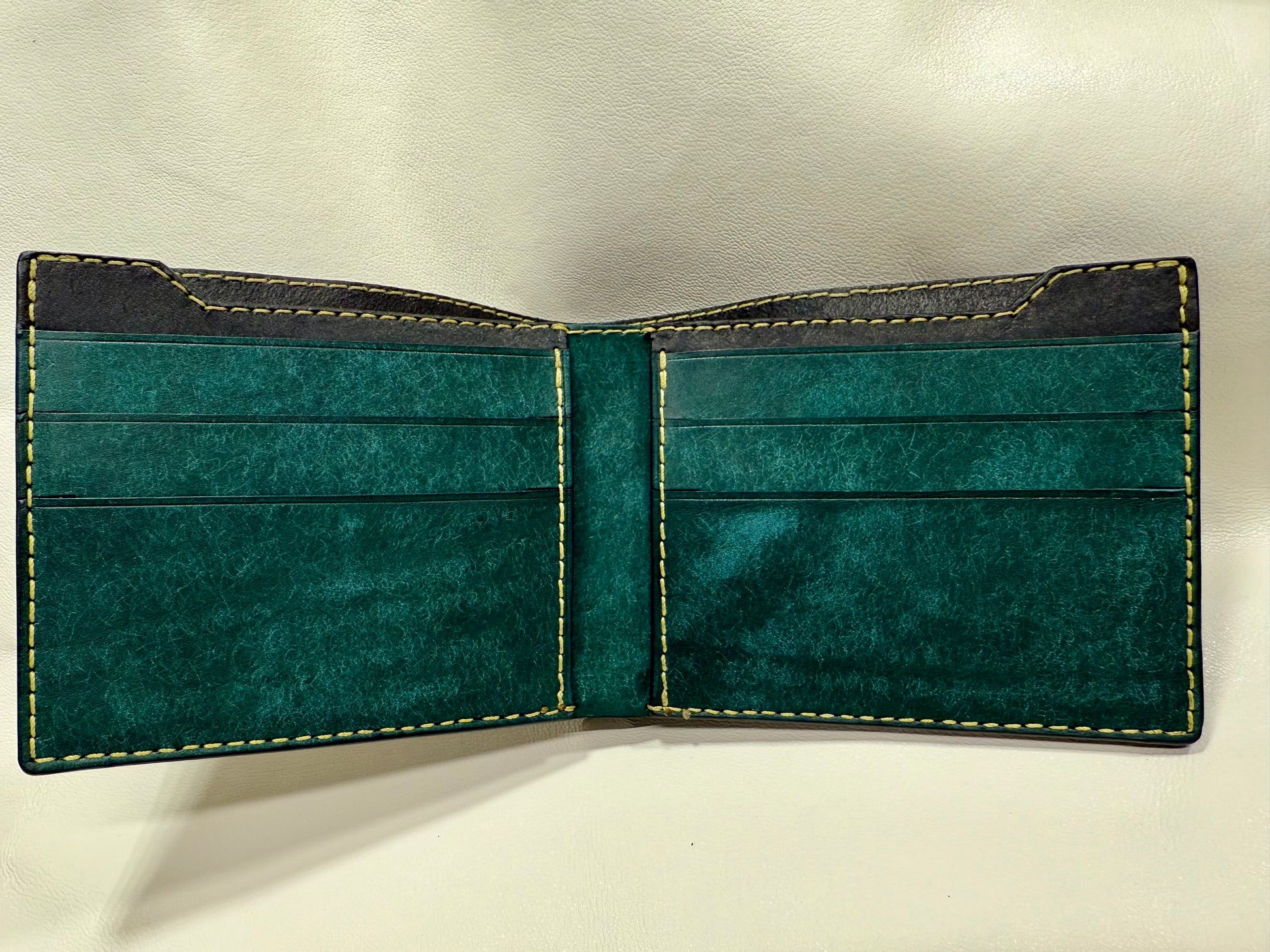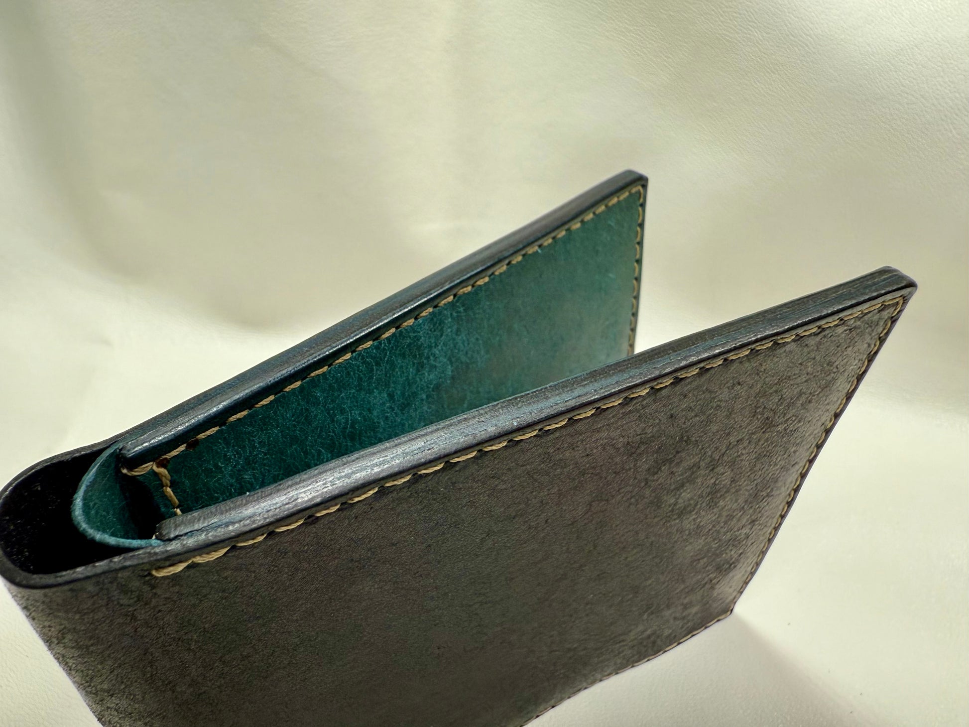 Boja vanjskog plašta je crna dok je unutarnji dio izrađen od aqua boje. Novčanik može čuvati minimalno 6 kartica i ima jednu pregradu za novčanice. Unutrašnjost pregrade za novčanice je polirana Tokonole-om. Korišten je Linhasita konac te su zahtjevniji spojevi dodatno ojačani. Rubovi su brušeni te isto polirani Tokonole-om.